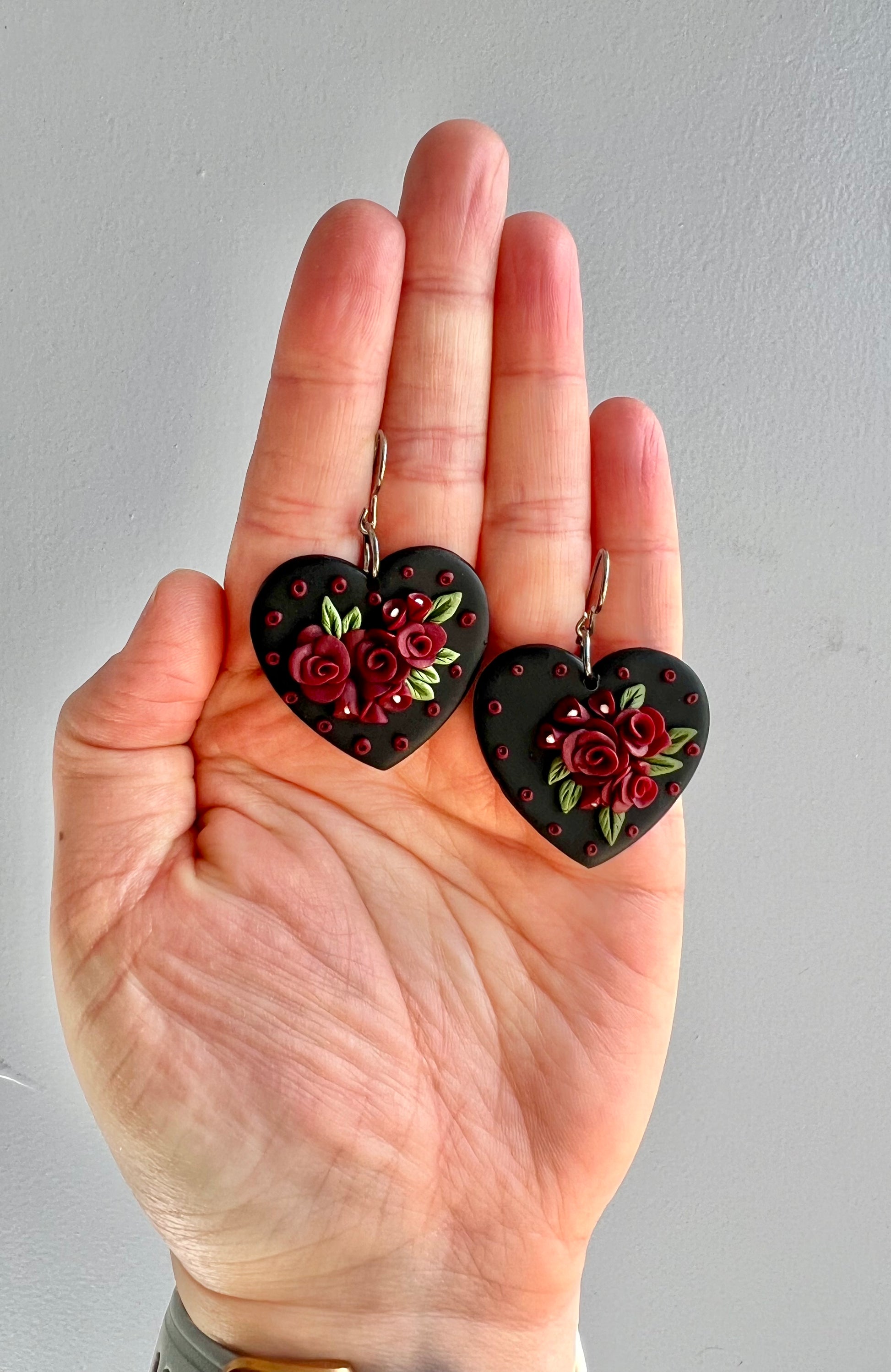 Each pair of earrings are meticulously crafted by hand, showcasing delicate crimson roses intricately sculpted onto a sleek black heart.