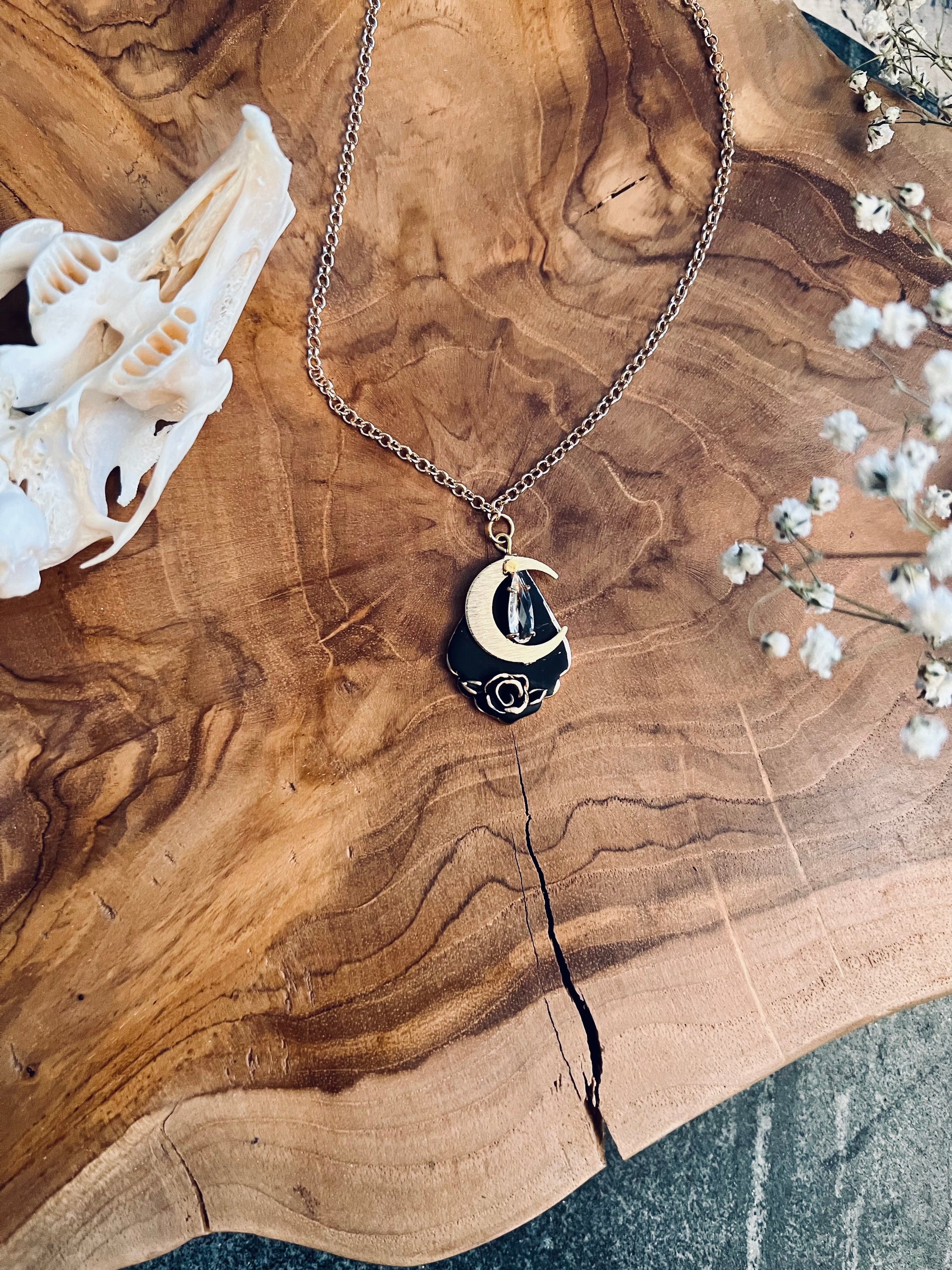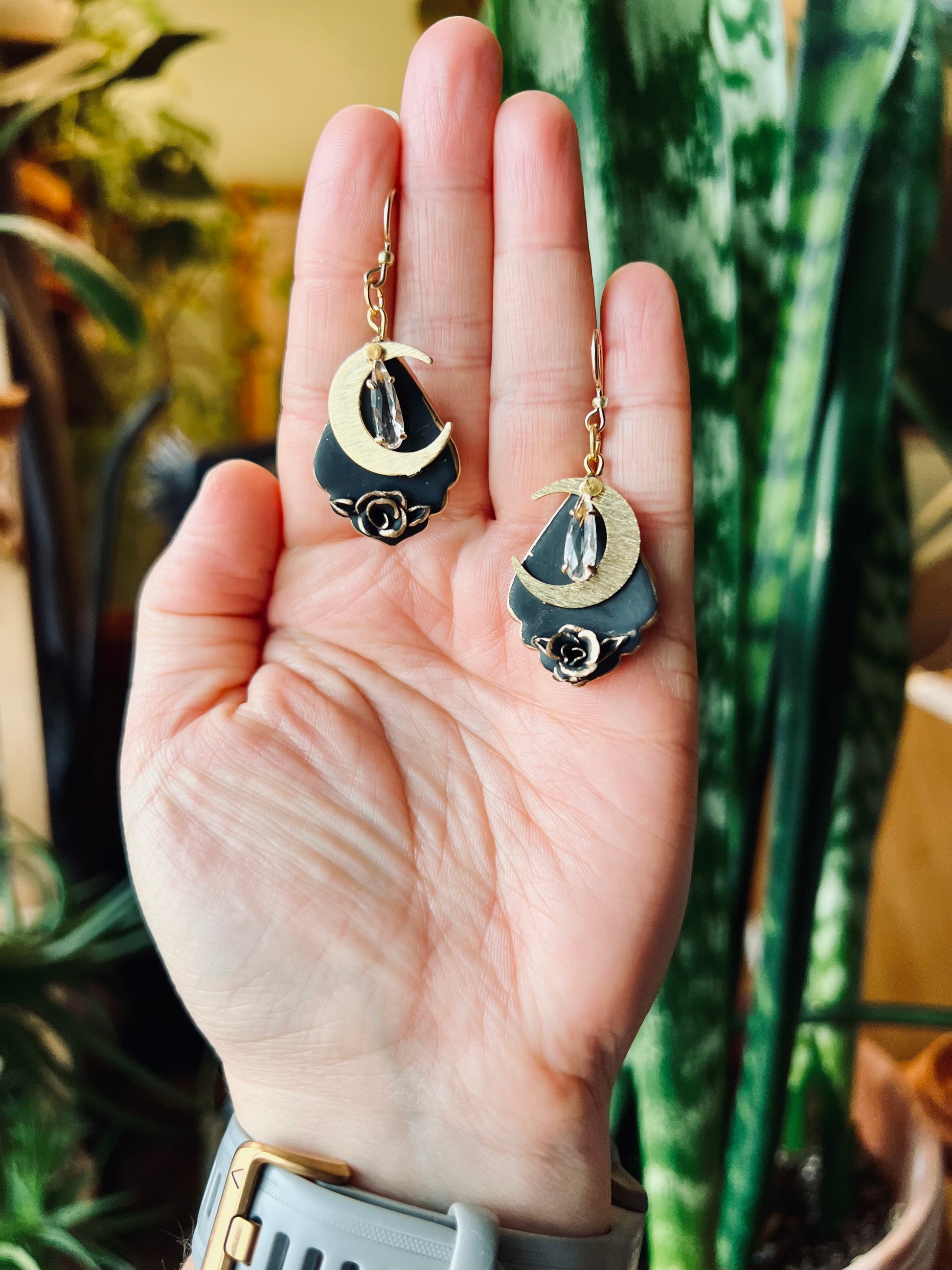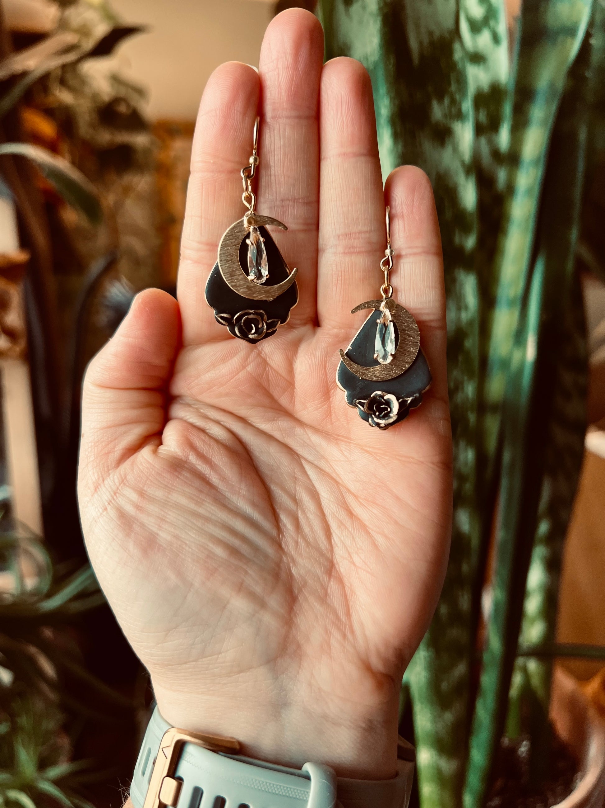 Illuminate your style with the celestial elegance of our Luna-inspired earrings. In the depths of black, golden accents shimmer, featuring a delicate rose and a crescent moon charm. Embrace the lunar goddess's mystique, symbolizing intuition, femininity, and the ever-changing cycles of life.