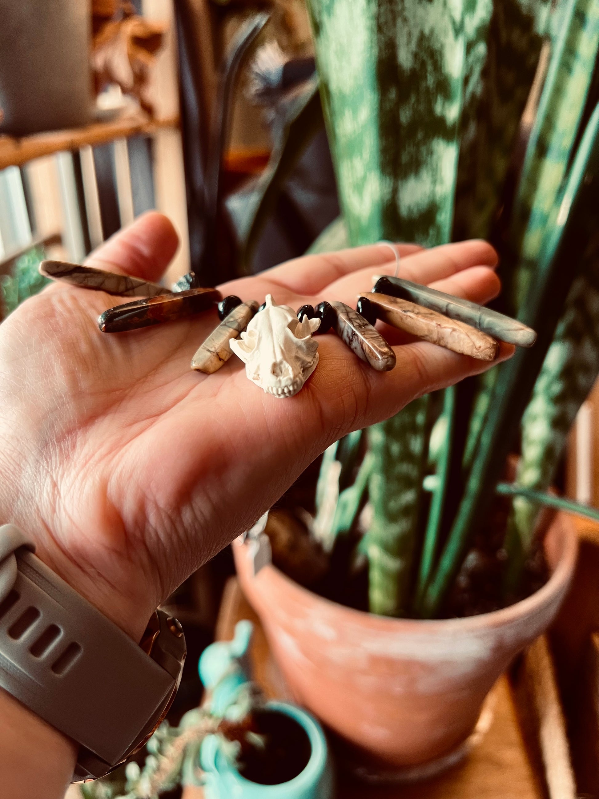 The Wolf skull is handcrafted out of polymer clay, it is not a real bone.