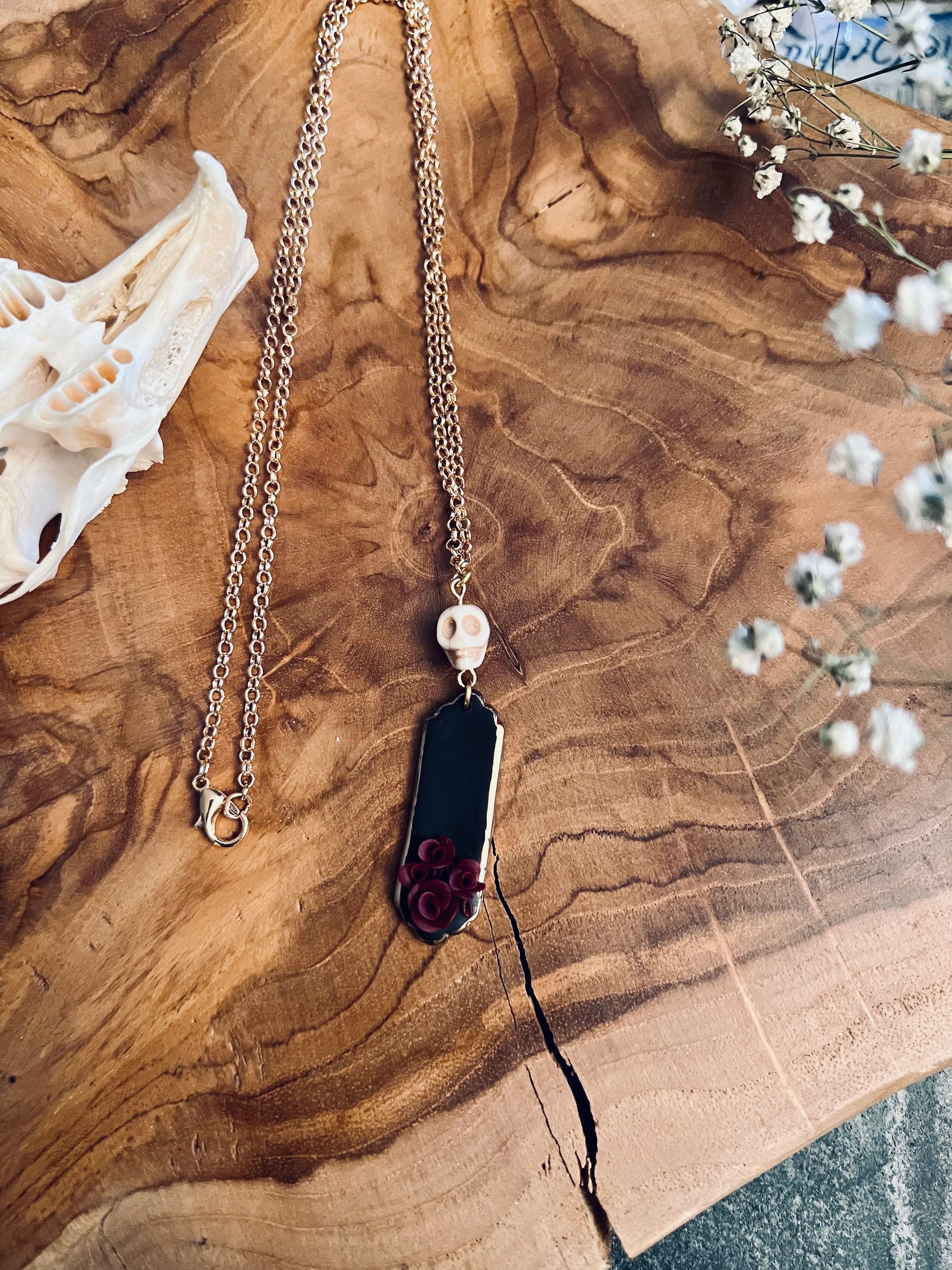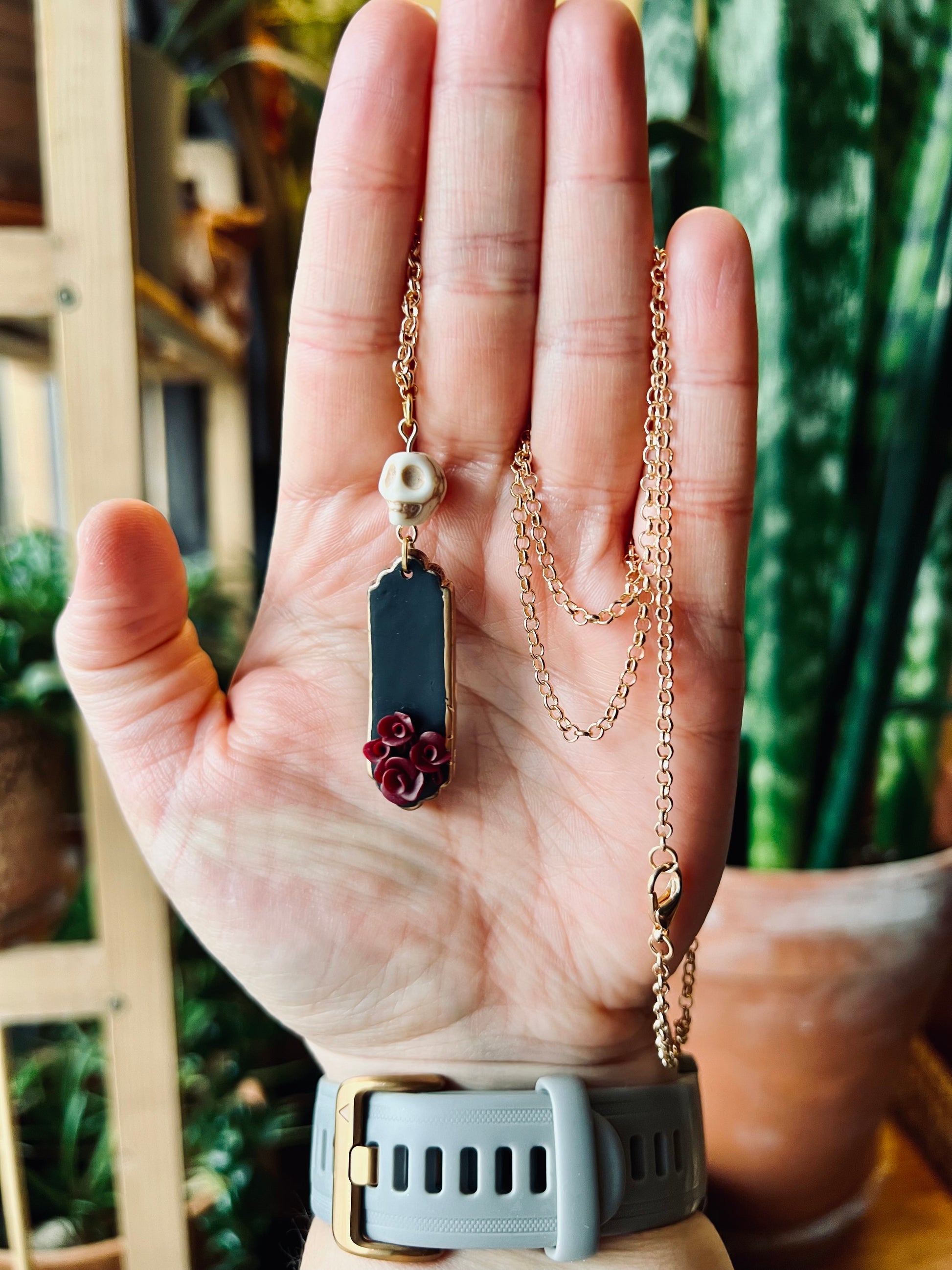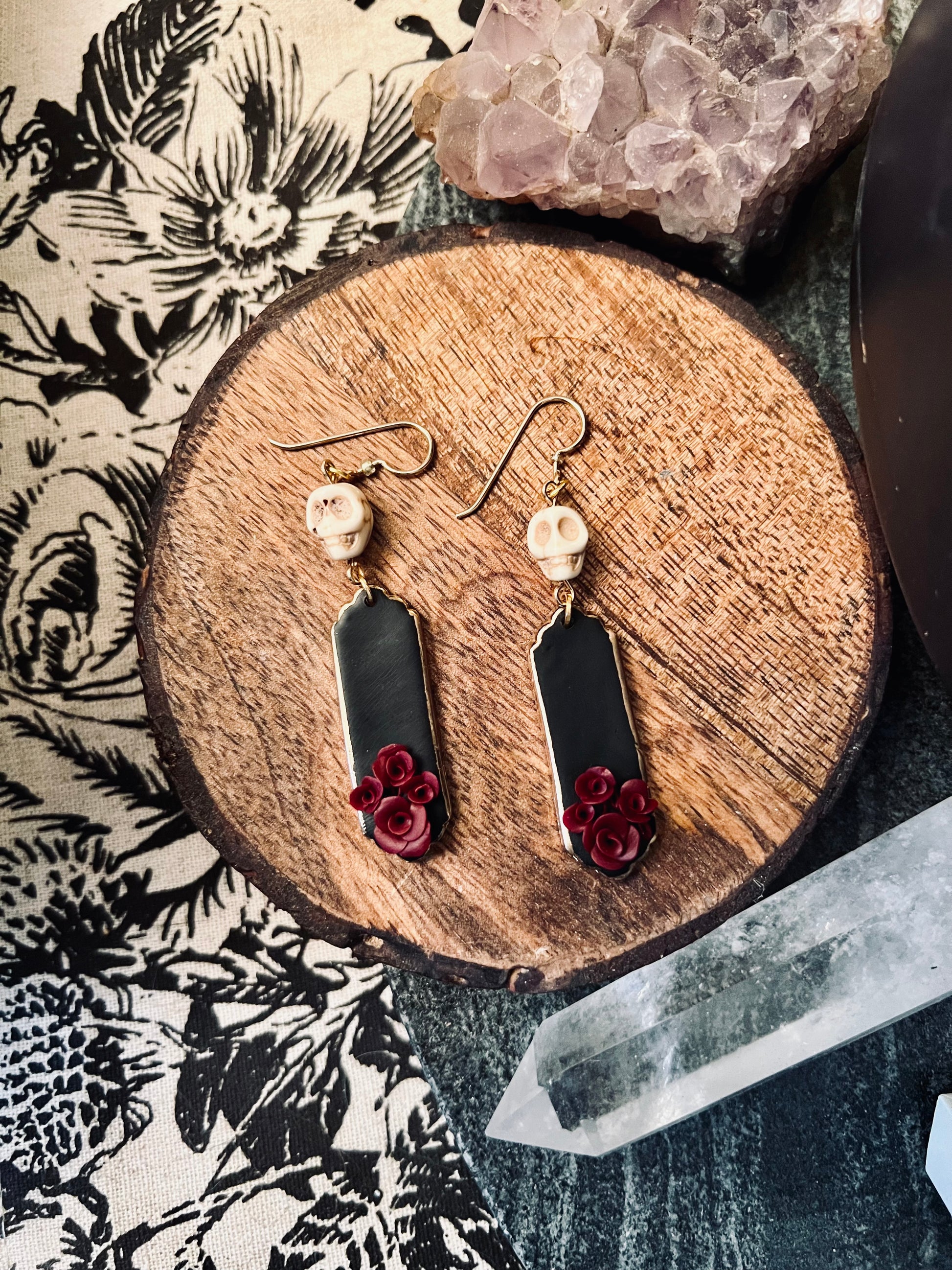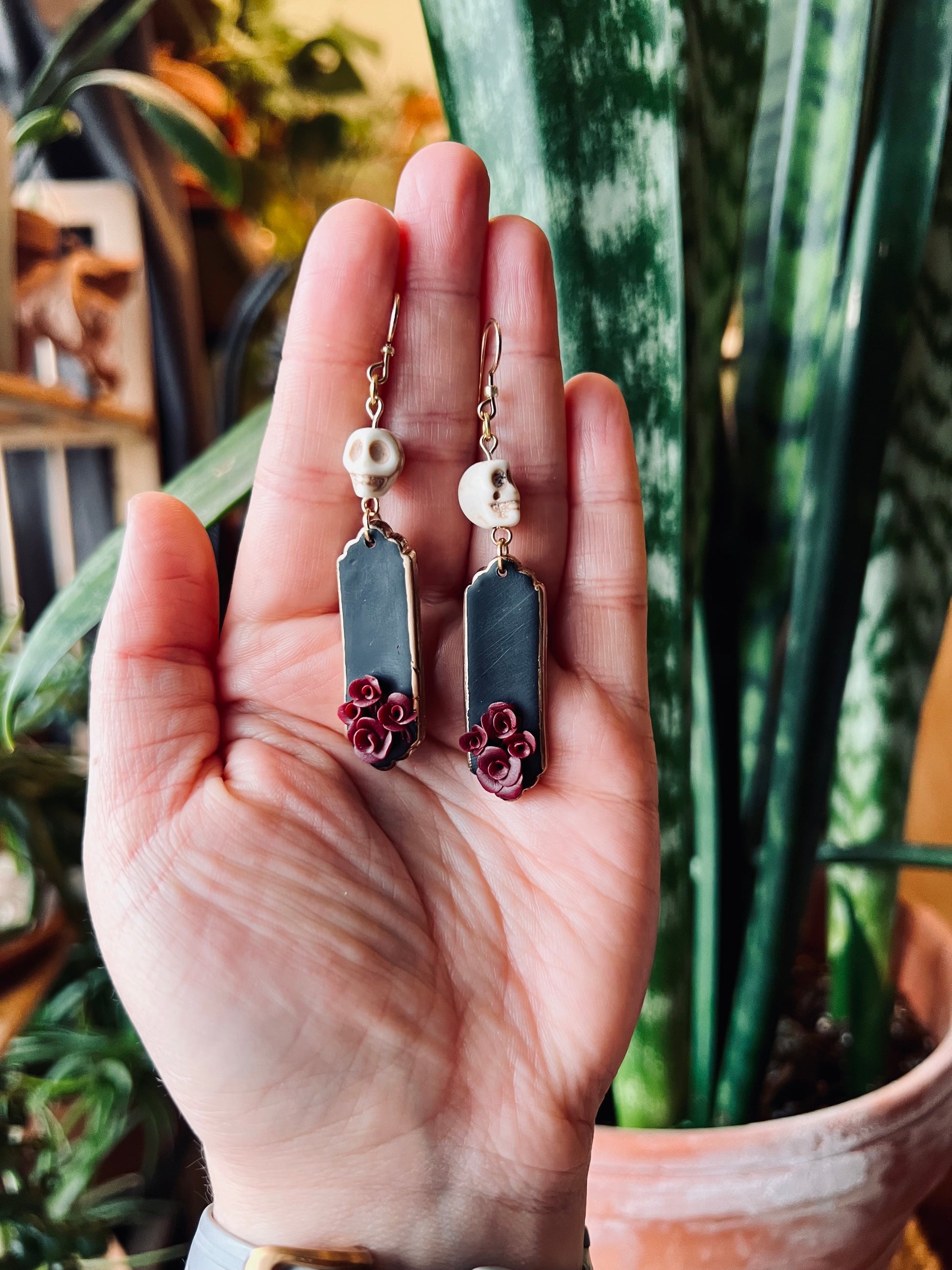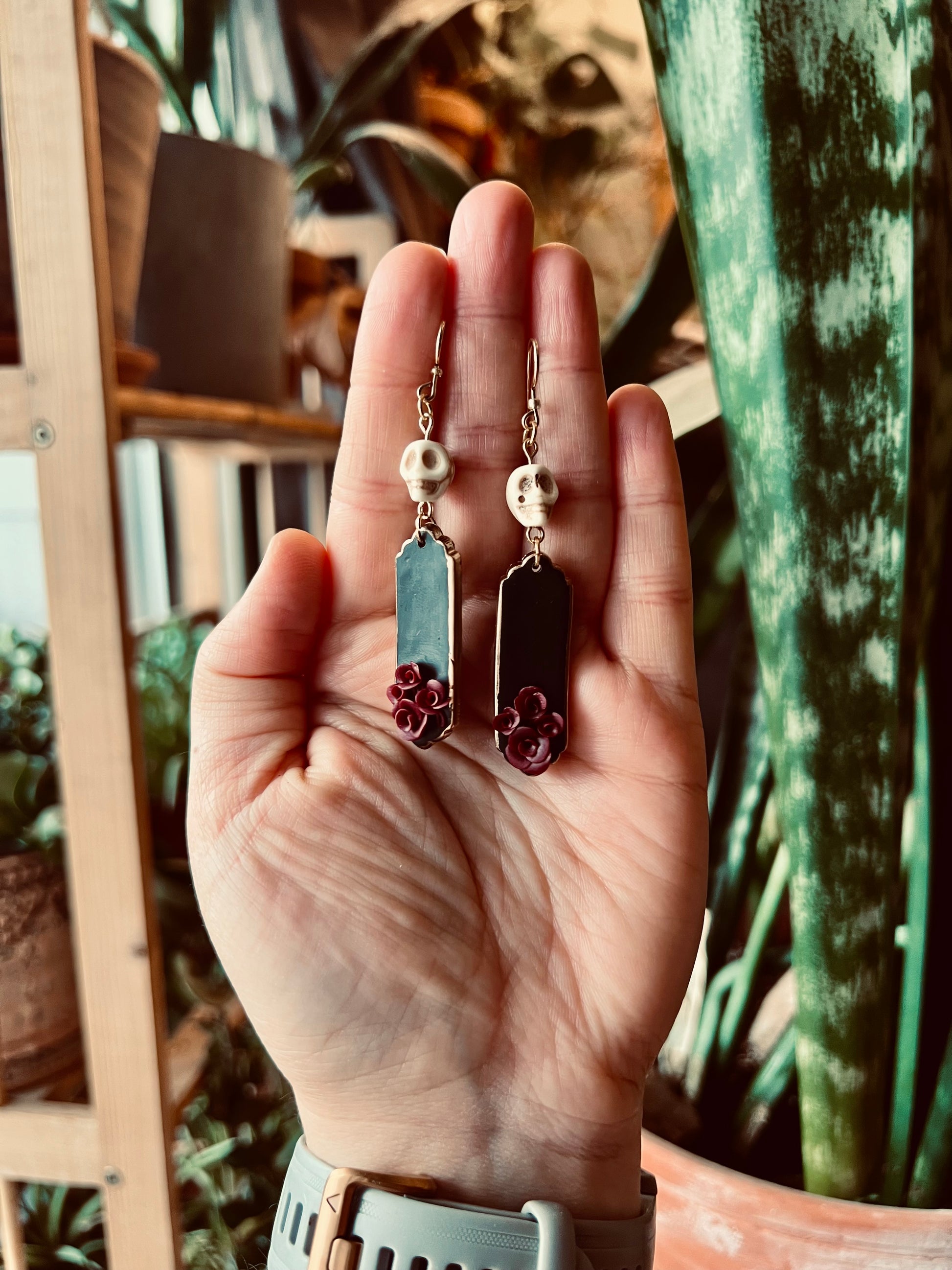 A Haunting Ode to Gothic Elegance. These striking earrings, adorned with sculpted crimson roses and a captivating skull charm, evoke the timeless allure of Edgar Allan Poe's macabre tales. Set against a backdrop of deepest black, accented with hints of opulent gold, they whisper of darkness and mystery. Wear them as a tribute to the poetic beauty found in the depths of the unknown. Let 'Nevermore' adorn your ears as a symbol of gothic sophistication and eternal fascination