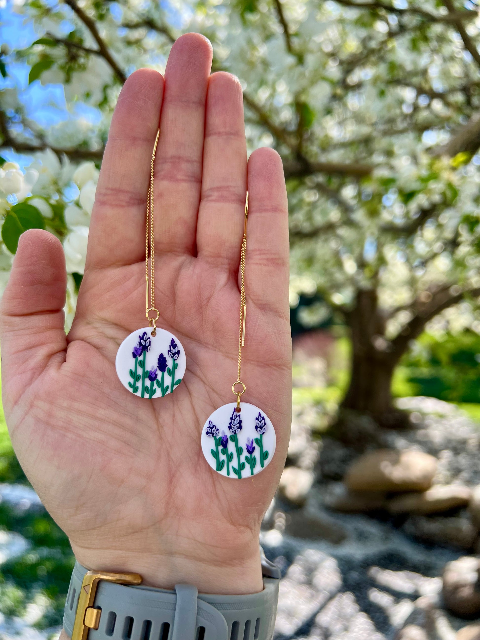 These earrings are more than just accessories; they are a testament to the beauty of nature's simplicity. The serene white backdrop symbolizes purity and clarity, while the hand-sculpted lavender flowers evoke the tranquility of a sun-drenched lavender field in full bloom.