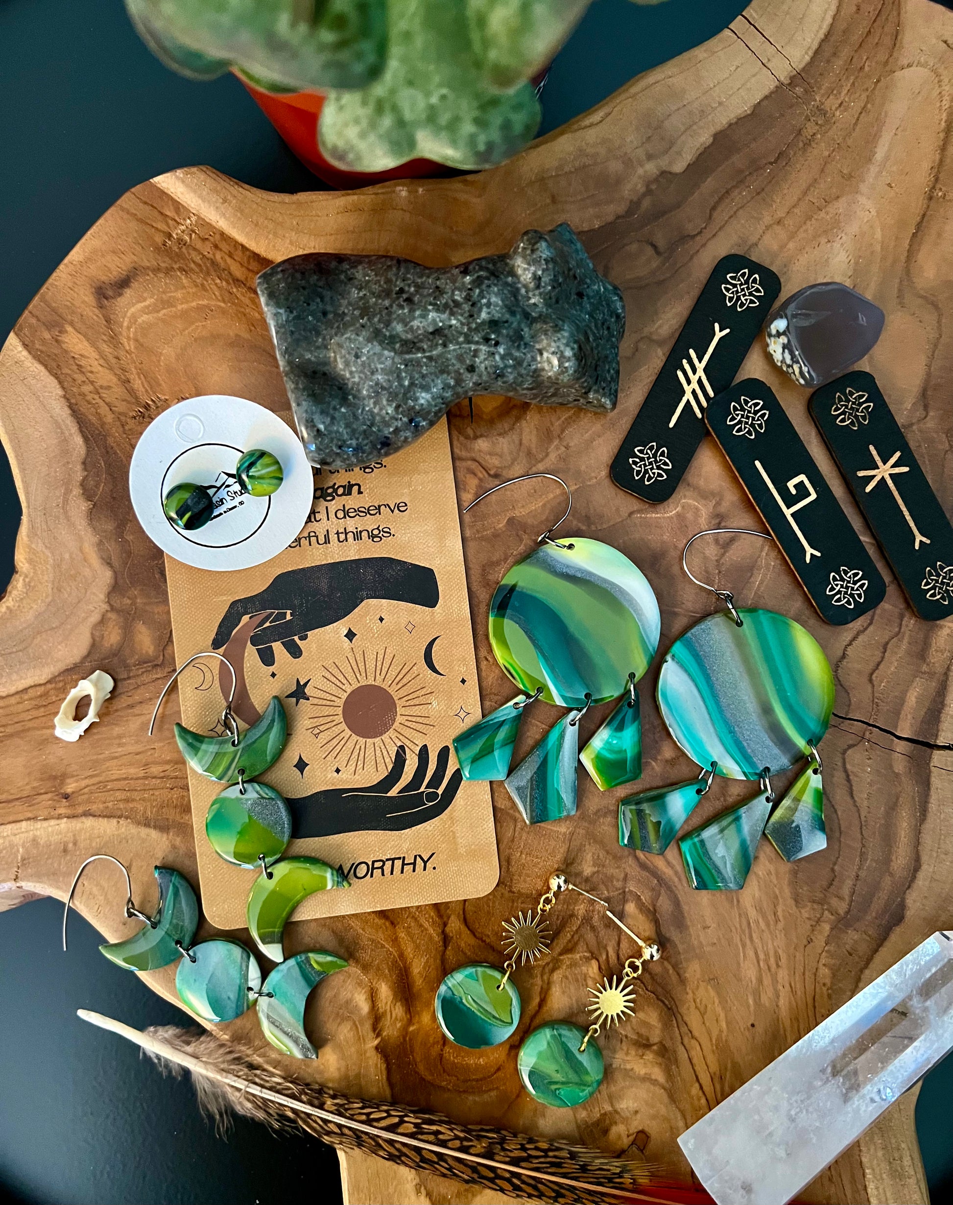 The color green represents rebirth, renewal, and immortality. These earrings bring the wearer the energy of the earth, in order to grow and bring balance.